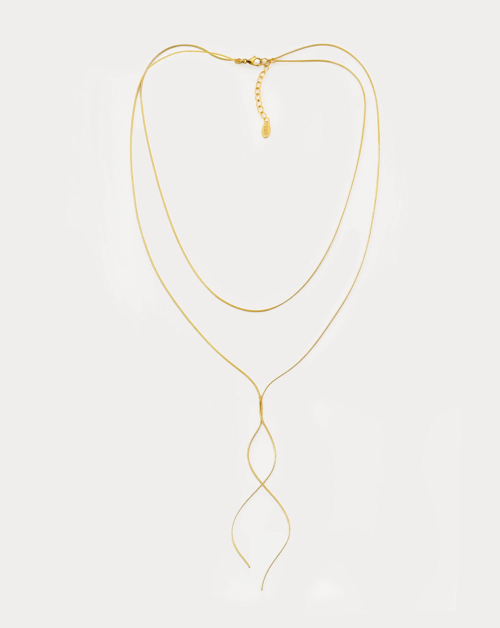 Design e versatilità: la collana Catalina Lariat è pensata per slanciare il collo e valorizzare ogni scollatura. Il doppio filo e la chiusura a Y creano un gioco di proporzioni raffinato e sensuale. Il dettaglio rigido centrale enfatizza la linea verticale e dona struttura al design, ispirato alle silhouette minimal ma eleganti dei gioielli dominicani contemporanei.