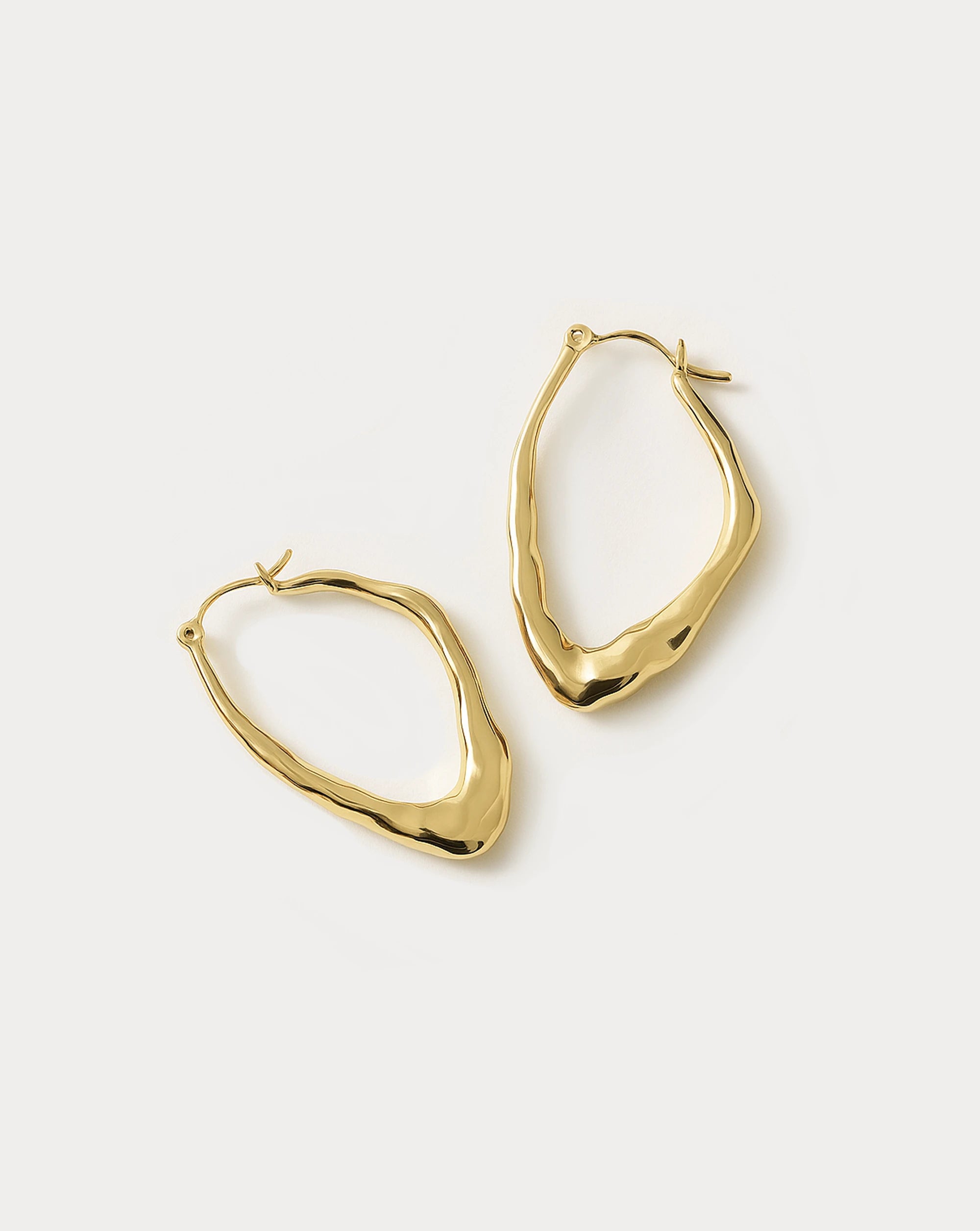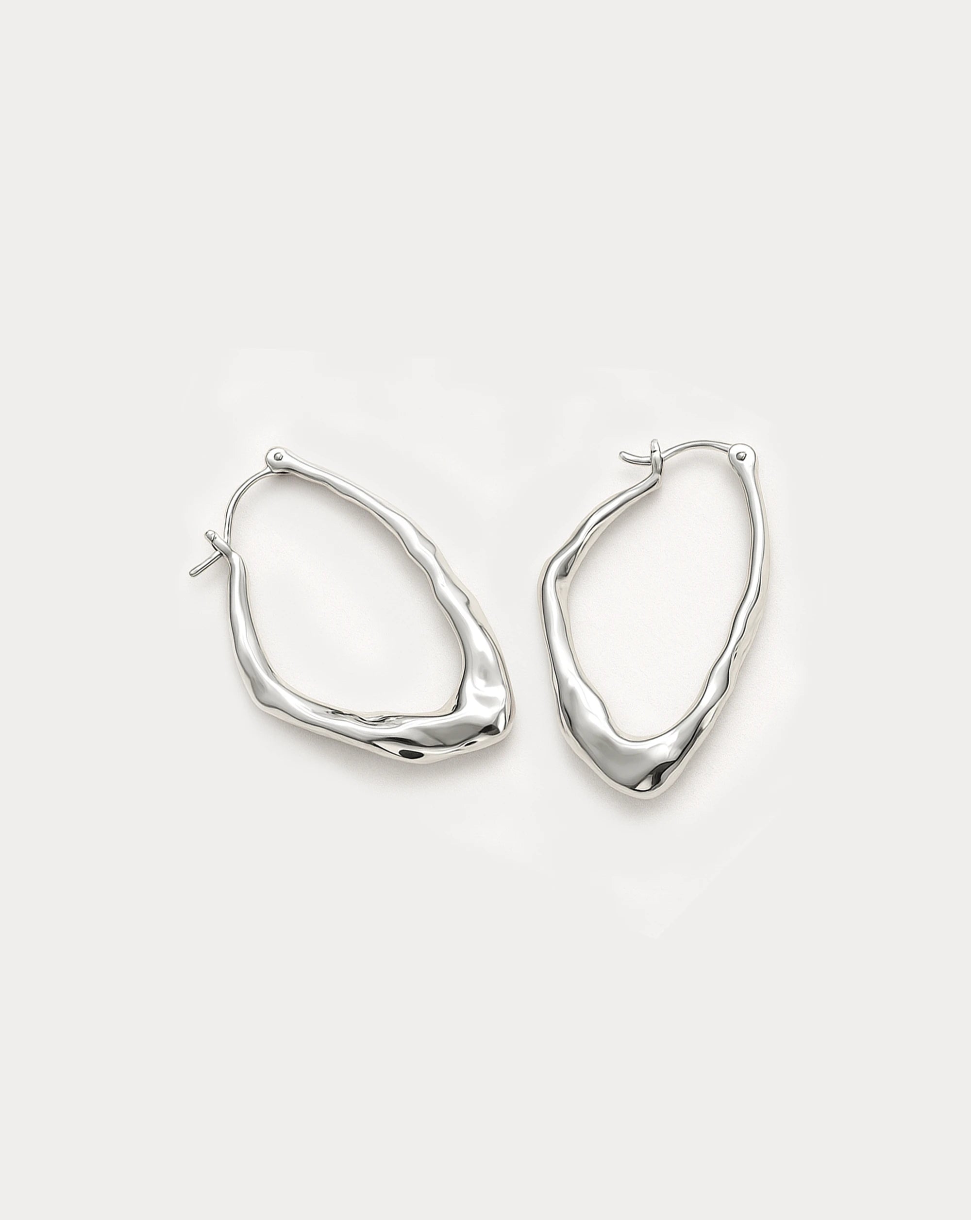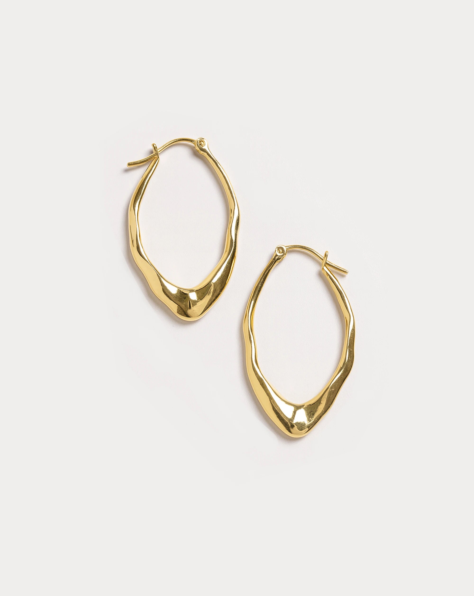 Orecchini a cerchio dalla forma irregolare e fluida, ispirati alle onde delle spiagge caraibiche. Il design organico, morbido e lucente li rende perfetti per aggiungere un tocco scultoreo a qualsiasi outfit, dal più essenziale al più sofisticato.